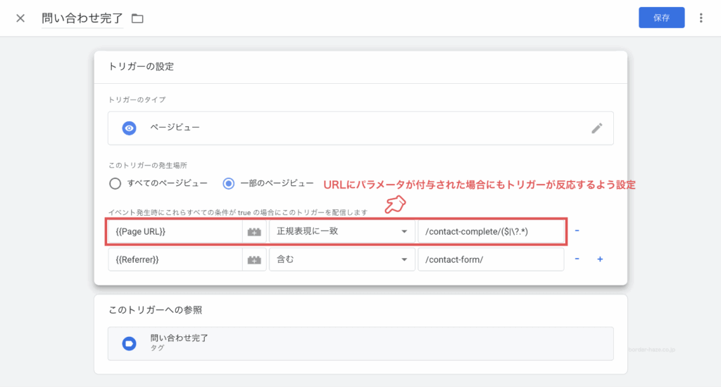 例えばサンクスページへの到達を計測する際、意図せずにパラメータが付与されてしまった場合にも計測できるよう、以下のように正規表現で指定します。