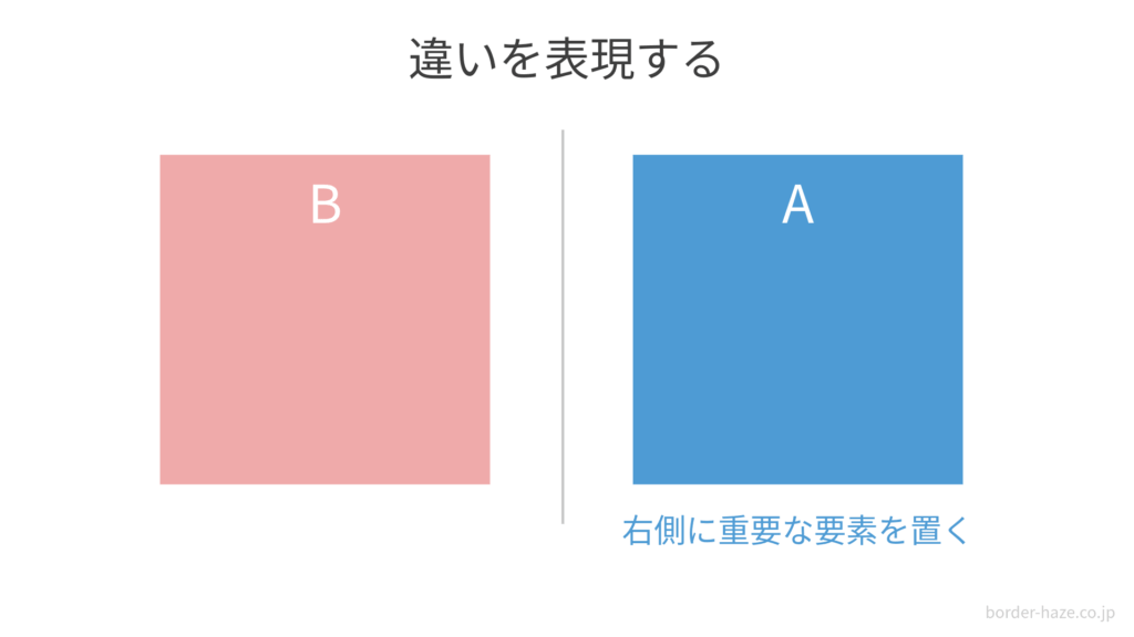 左右に並べたときに、重要な要素やポジティブな要素は右側に置くのがセオリーです。時間の流れを図解したときに左から右に流れるように見せることが多いことや、国際プロトコルにおいて向かって右側が上座になることが関係しています。