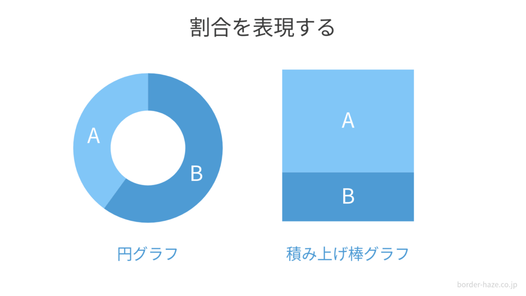売上の内訳やアンケートの回答比率など、全体の中でどれくらいの割合を占めるかを表現したいときは「円グラフ」や「積み上げ棒グラフ」を使います。