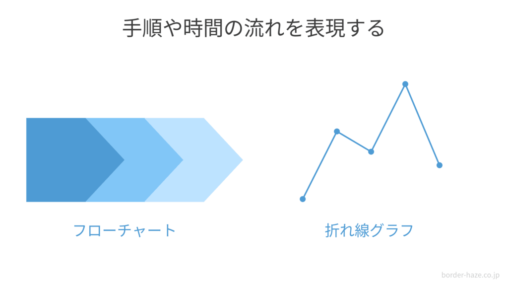 3. 手順・流れ:ステップ(フロー図)や時間経過(折れ線グラフ)。