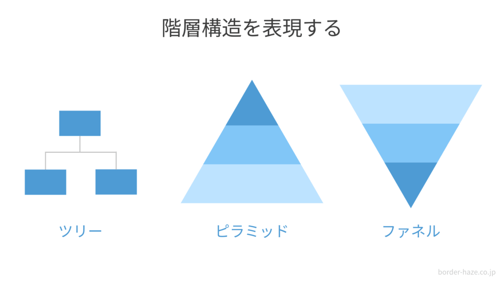 組織図や情報の親子関係などを表現したいときは「ツリー」や「ピラミッド」、漏斗の形をした「ファネル」を使います。