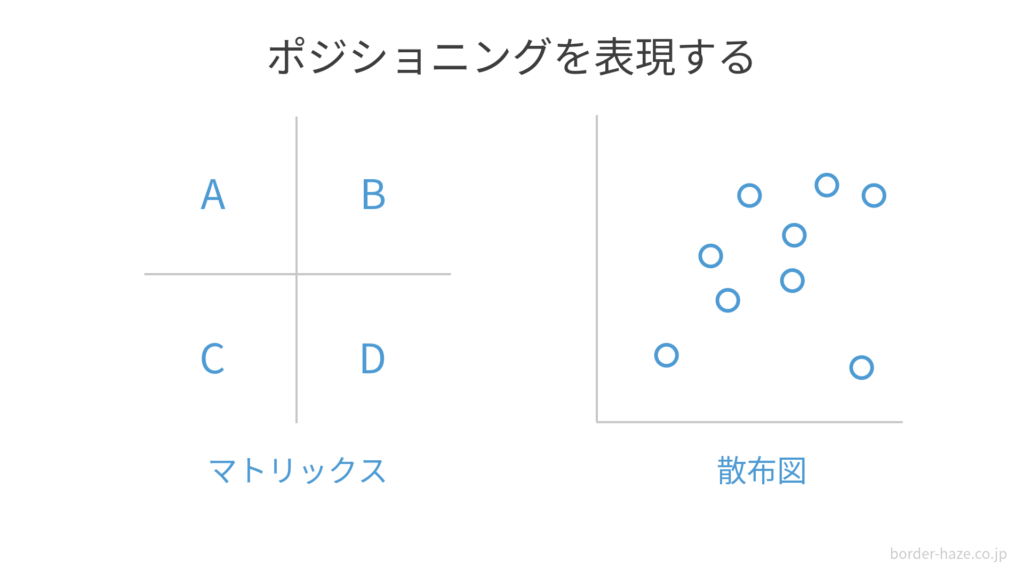 5. ポジショニング:2軸での位置づけ。未来の戦略は「マトリックス」、過去の分析は「散布図」。