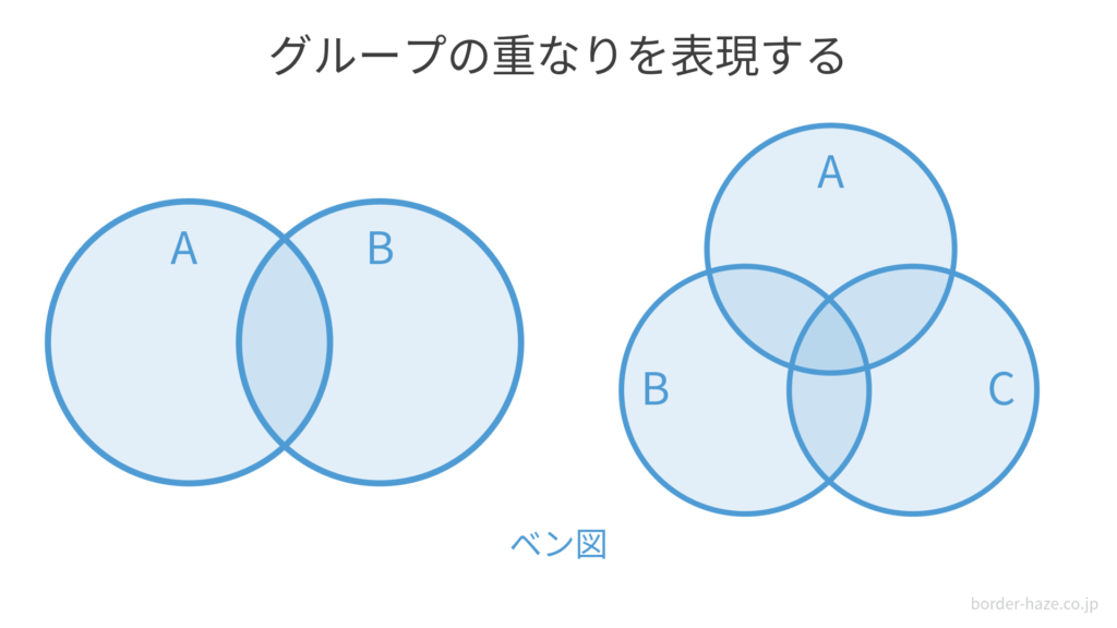 複数のグループの間にどのような共通点や違いが重なり合っているかを表現したいときは、円を重ねた「ベン図」を使います。