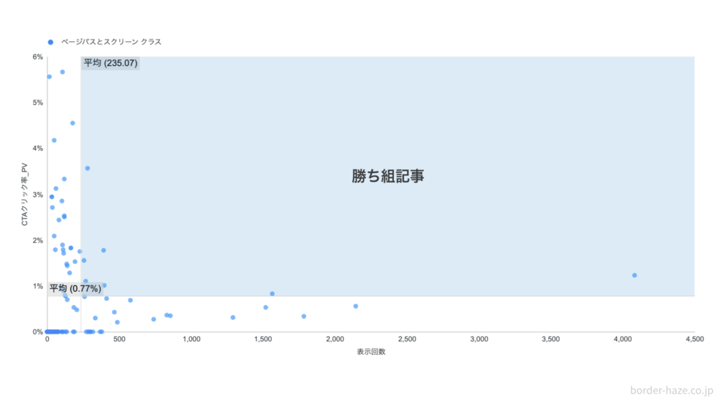 右上のエリアにある記事はPVもCTAクリック率も平均より高い「勝ち組記事」としてわかりやすく分類することができます。