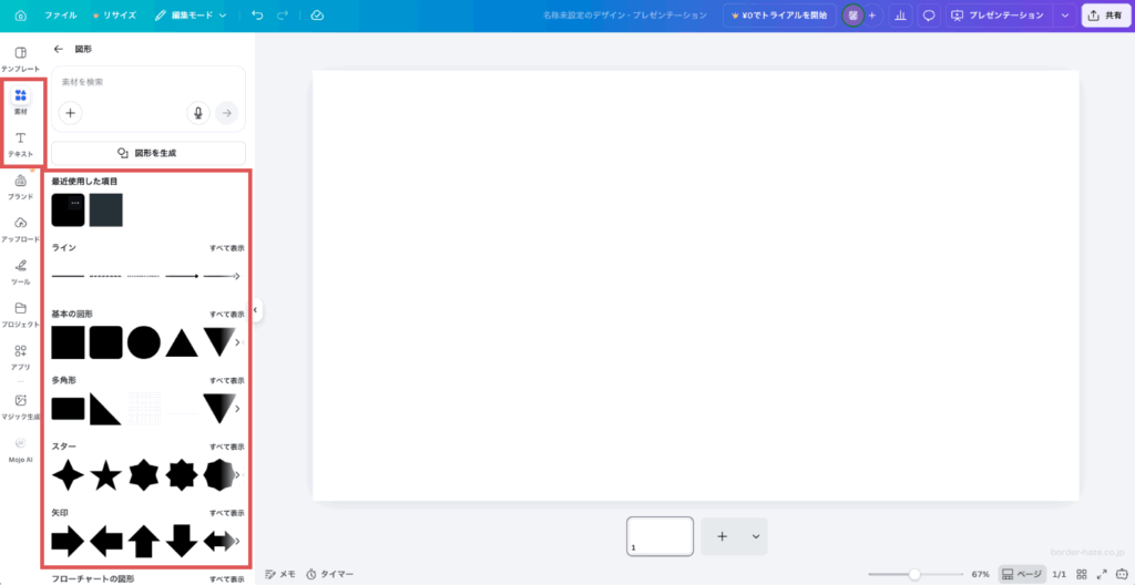 編集画面が表示されたら、左側の「素材」メニューから「図形」を選択し、使いたい図形を選びます。左側の「テキスト」からは文字を入れることが可能です。