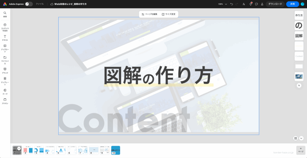 使い方はCanvaとほぼ同じなので、どちらを使っても大差ありません。私は最近はAdobe Expressを使う機会が多いです。