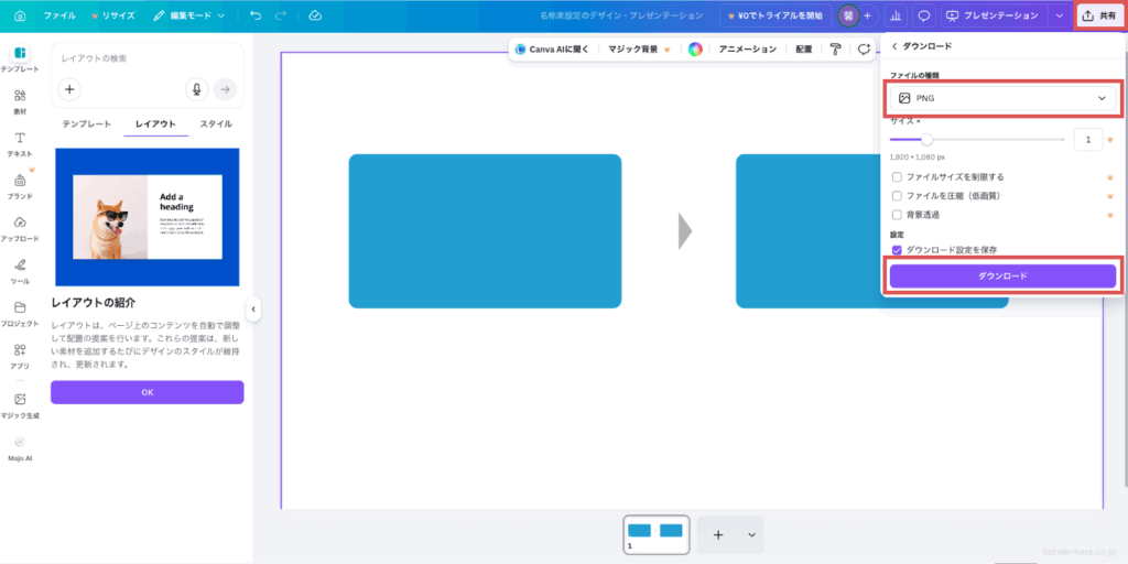 図解ができたら、右上の「共有」ボタンからダウンロードできます。その際、ファイルの種類は「PNG」を選択します。